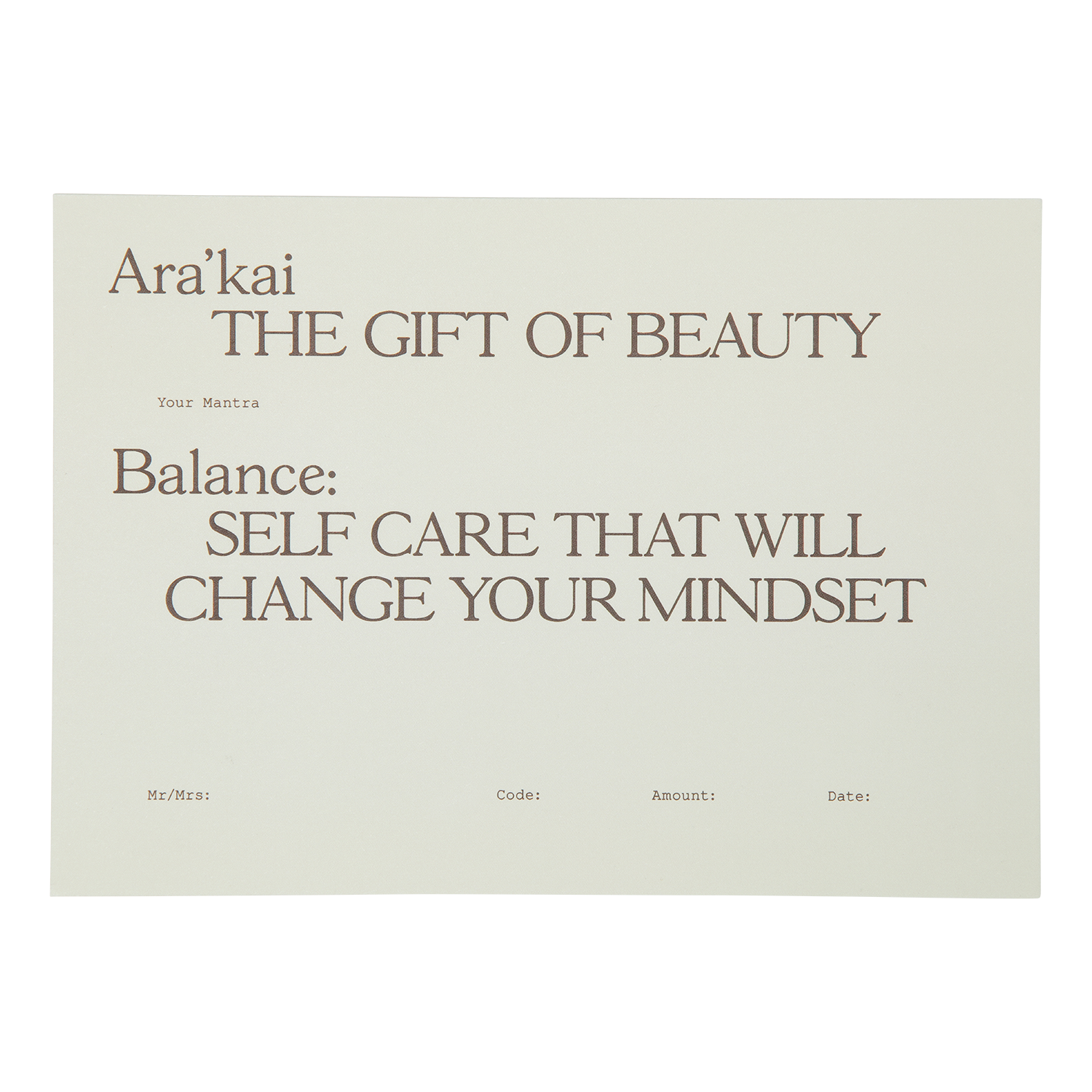 The Ara´kai Beauty Gift Cards are redeemable at Ara´kai Beauty only (both online and in-store). The value of the gift card purchased does not apply to any promotional offers. Gift cards cannot be used to purchase other gift cards or redeemable for cash. Unfortunately, the card cannot be replaced if lost or stolen.